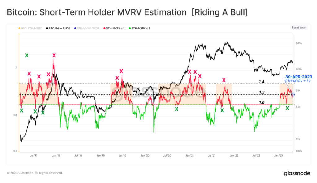 In the graph, Glassnode has marked the lines of the 7-day average Bitcoin STH MVRV that have been relevant to the price of the cryptocurrency during the last few years.