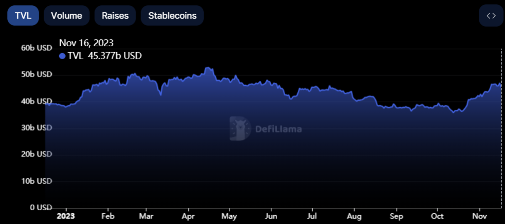 While current TVL is slightly below the 2023 peak set on April 15 of $52.9 billion, it has risen since the start of the year. Since Jan. 1, TVL across the crypto market is up $7 billion, eclipsing $45 billion.