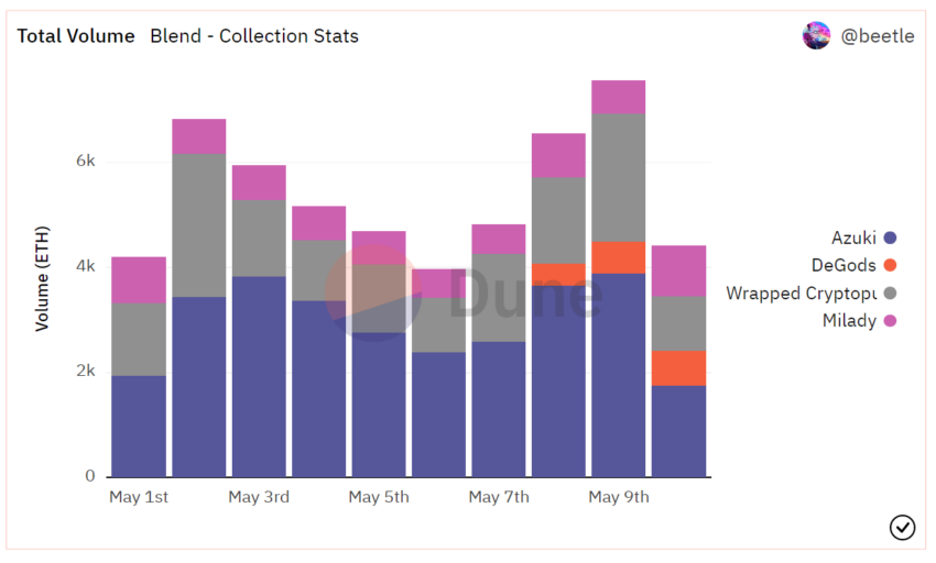 Blend currently supports loans backed by four NFT collections: Miladys, Azukis, DeGods, and wrapped versions of CryptoPunks.