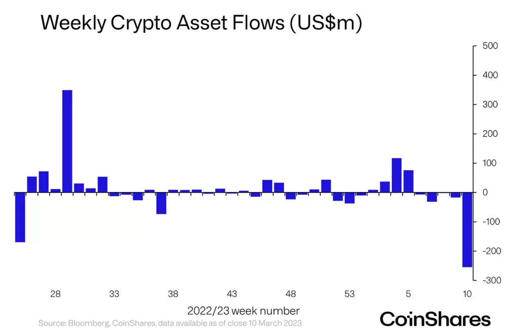 According to a new report by digital asset investment firm CoinShares, product outflows registered the largest single weekly outflows on record last week. It found that record-breaking outflows of $255 million were removed from digital asset investment products last week, marking the fifth consecutive week of outflows. Last week’s outflows represented a mere 1.0% of total assets under management (AuM).Â