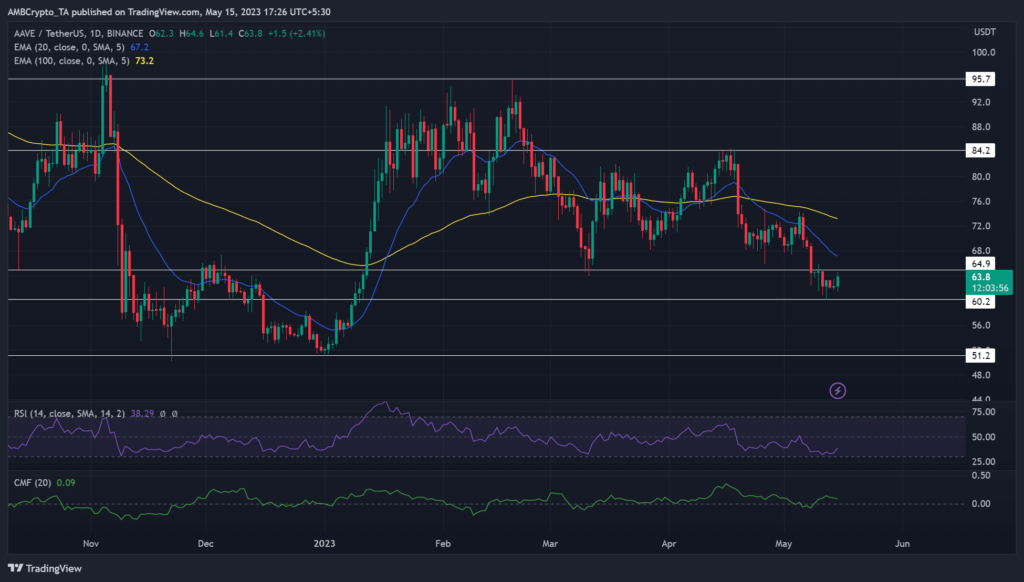 Aave [AAVE] has been oscillating between the $60 – $65 price range in the past five days. The narrow range followed a breach below the March swing low of $65 on 8 May. Bitcoin [BTC] reclaimed the $27k price zone at press time, offering altcoins little recovery hope.