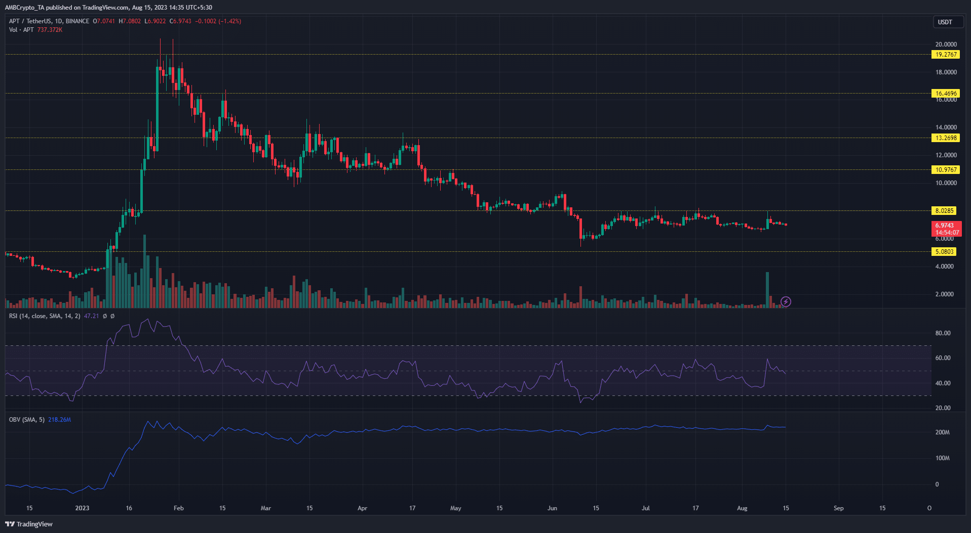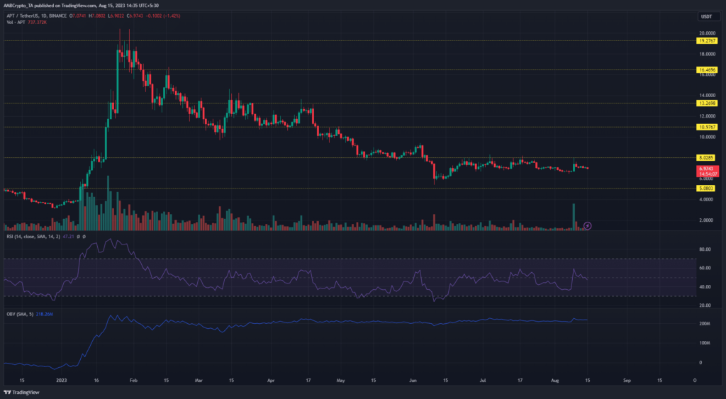 Aptos [APT] has mirrored Bitcoin’s [BTC] ranging price action over the past month. While BTC ranged in the short term between $26.1k to $26.6k, APT’s oscillating price action between $5 and $8 has stretched over a two-month period.