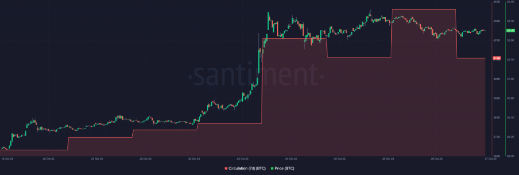 On-chain data from Santiment also showed that BTC could continue consolidating. This assertion was derived from the seven-day circulation. At press time, the Bitcoin circulation was 416,000. This metric is the number of coins used in transactions within a given timeframe.
