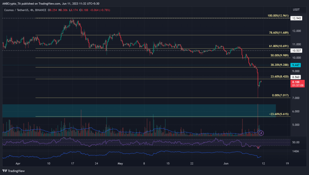 The Fibonacci retracement tool was placed between a lower high in mid-April ($12.96) and a recent lower low ($7). The $5.54 – $6.53 (cyan) support zone is a bullish order block (OB) formed on the 1D chart on 18 June 2022. It could ease further bearish pressure on ATOM.