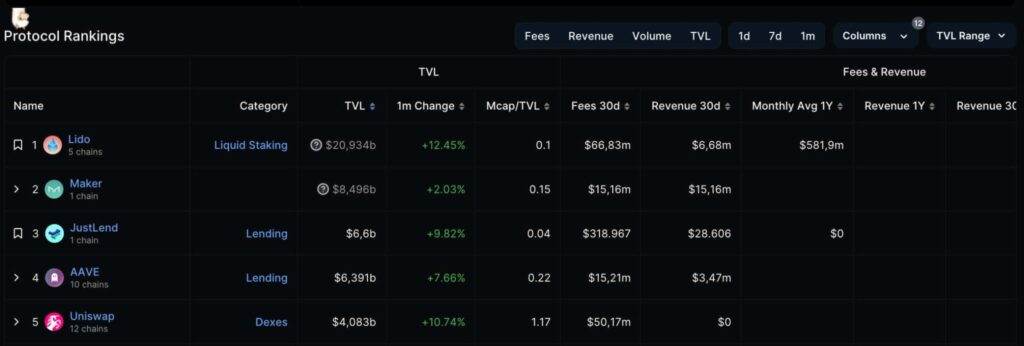 Maker is the second most valuable DeFi project, with $8.49 billion in total value locked, up 2% in the last month. Notably, MKR has an MCap/TVL ratio of 0.15, which suggests an oversold capitalization and a good investment opportunity.
