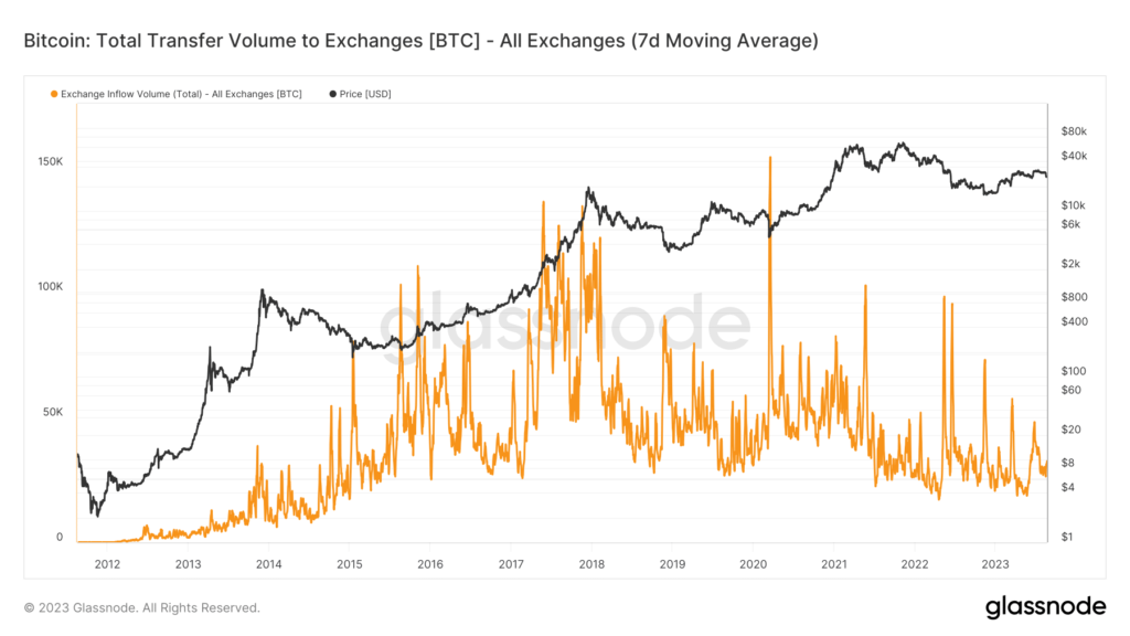 Expanding the analysis, a comprehensive overview of the cumulative inflow volume, according to Glassnode, revealed that the overall inflow exceeded 32,000. These figures would naturally imply a substantial influx of BTC into exchanges, indicating a potential sell-off.