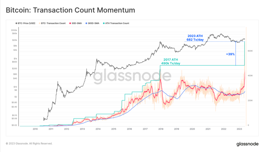The reason behind this explosion in the transaction count is the emergence of the BRC-20 tokens, fungible tokens created on the BTC blockchain using the Ordinals protocol (a way to inscribe data like text and images directly into the chain).