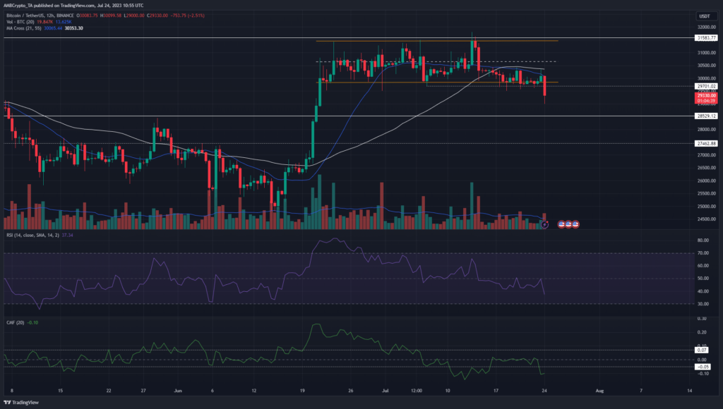 Bitcoin [BTC] saw a range established over the past month. There were hopes of a bullish breakout on 13 July when the prices reached the $31.8k mark, but the bulls were quickly rebuffed. Over the past week, it appeared that buyers were losing strength.