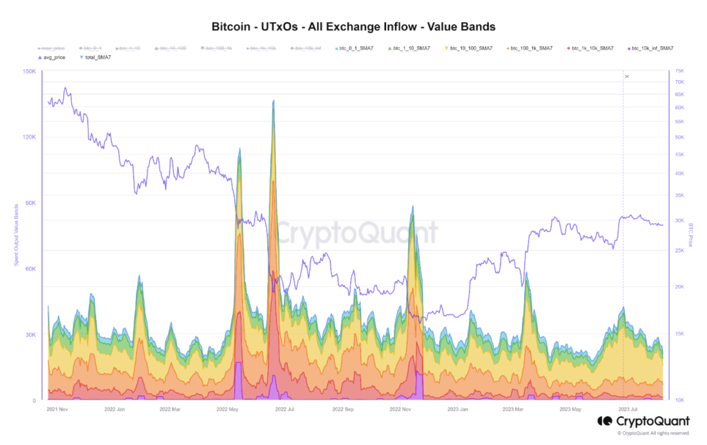 Further, the analyst observed BTC’s UTxOs Exchange Inflow on a 7-day moving average. This metric measures the amount of a crypto asset that has been deposited into exchanges from unspent transaction outputs.