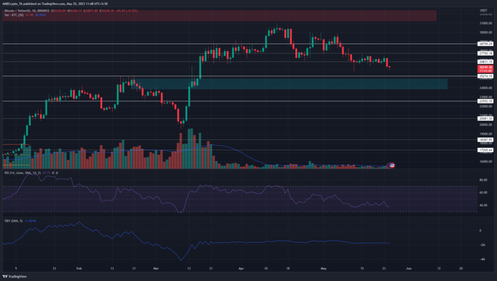 Over the past two weeks, the bulls tried desperately to defend the $26.8k-$27k area but were overcome on 24 May. Investors in traditional markets seemed to be worried about the U.S. debt ceiling, which in turn negatively impacted the crypto markets.