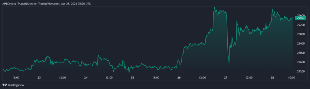 Following a spike to $30k on 26 April, the price of Bitcoin (BTC) made a sharp turn and dropped below $27K in less than an hour. We saw short bets getting liquidated in the market, which drove up the price of BTC. However, the bulls looked to have cheered a bit too soon, as the cryptocurrency market took a turn for the worse.