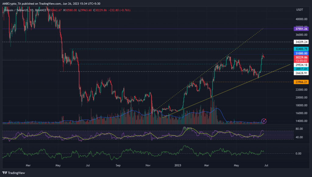 Bitcoin’s [BTC] price action has stayed above $30k since 21 June. It graced a new high in 2023 of 31.4k on 23 June but retraced to the $30k zone, trading at $30.2k at the time of writing.