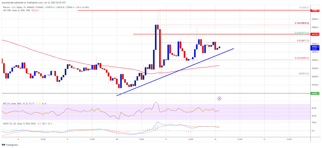 If Bitcoin’s price fails to clear the $30,700 resistance, it could start another decline. Immediate support on the downside is near the $30,500 level and the trend line.