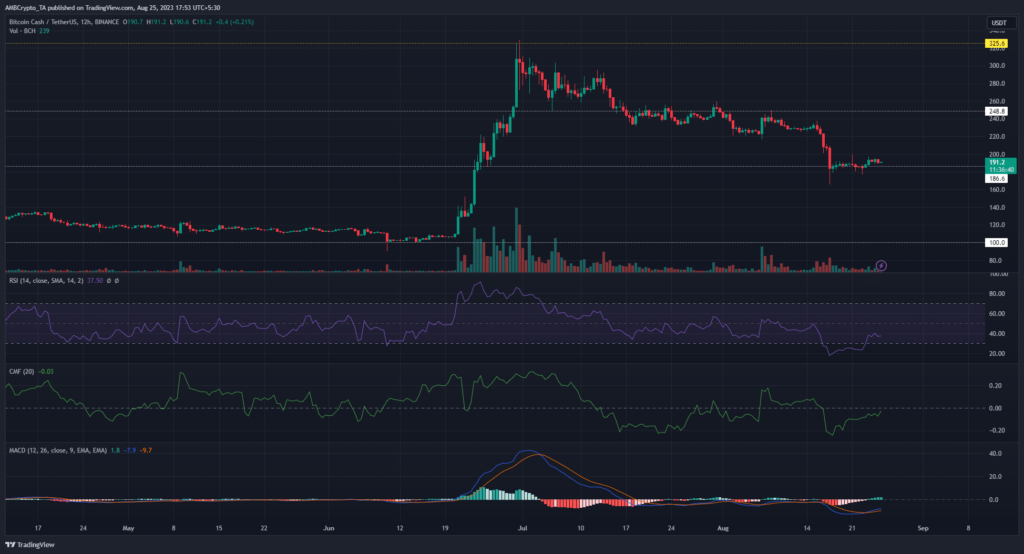 BCH’s press time price action on the 12-hour timeframe mirrored the June move with the price hovering above the $186 support level. This presents buyers with another opportunity for a significant rally.