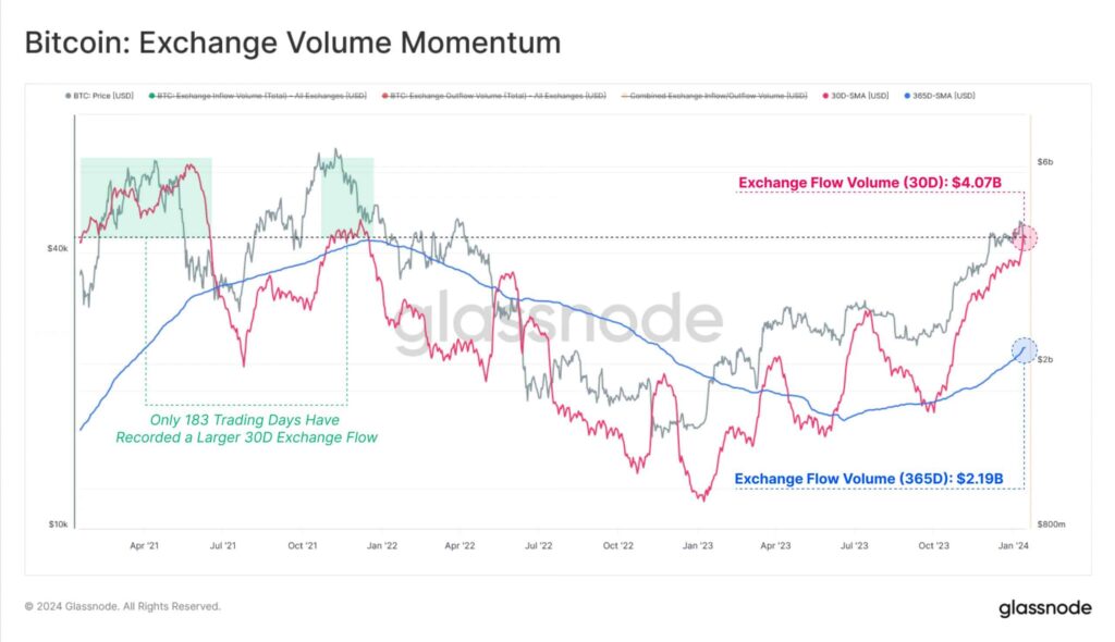 Interestingly, just 183 days in Bitcoin’s trading history have had a bigger exchange flow volume, Glassnode added.