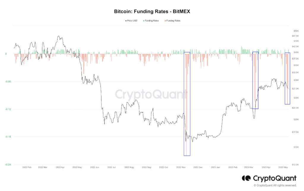 The metric observed some even more negative values following the November 2022 FTX crash, but the price didn’t see any appreciable surge following them. Though, nonetheless, Bitcoin still saw the bottom coincide with the red BitMEX funding rates.