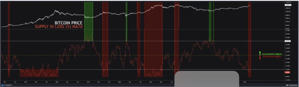 According to a CryptoQuant analyst, the current status of Bitcoin in loss is at historical lows. This metric serves as a valuable indicator to understand the cyclical trends in Bitcoin’s price.