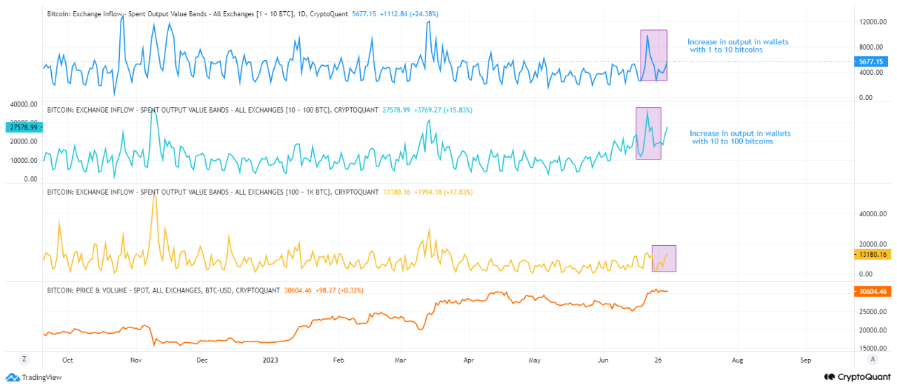 Analyst CryptoOnchain found further that the biggest increase in spent output in the last few days was observed in wallets that held between 10 to 100 BTCs. The analyst noted: