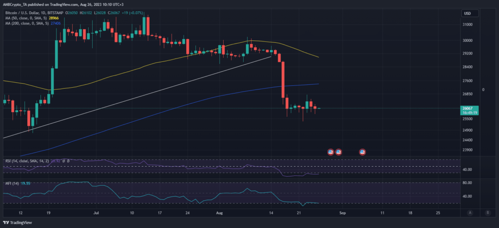 BTC exchanged hands at $26,054 at press time after experiencing some resistance near the same price range. The price is once again in a consolidation phase while also being in the oversold zone. Because of this, the subsequent downside in case of sell pressure could be limited.