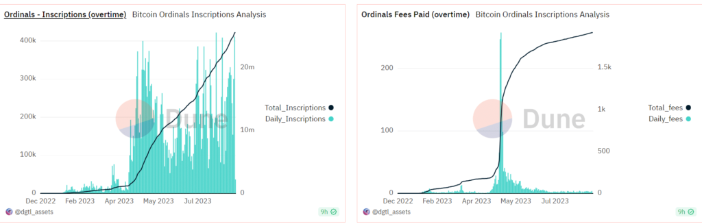 Based on data from Blockchain.com, the total count of Bitcoin transactions exceeded 600,000 on 20 August, reaching a figure of 612,461 transactions. Looking at the Dune Analytics chart with this, the total number of Inscriptions observed on the same date surpassed 411,000.