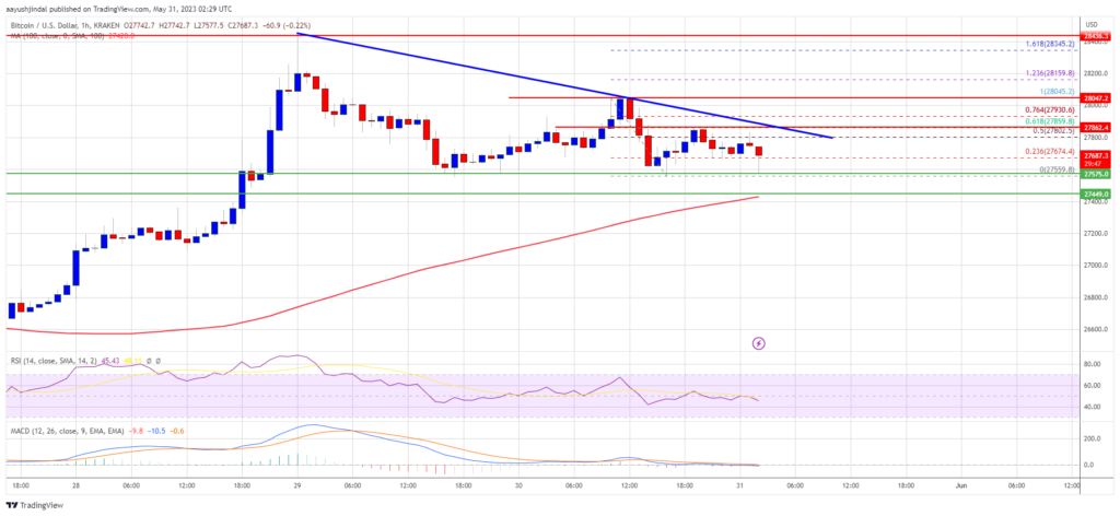 Bitcoin price is consolidating above the $27,500 support. BTC could start a fresh increase unless there is a clear move and close below $27,500.