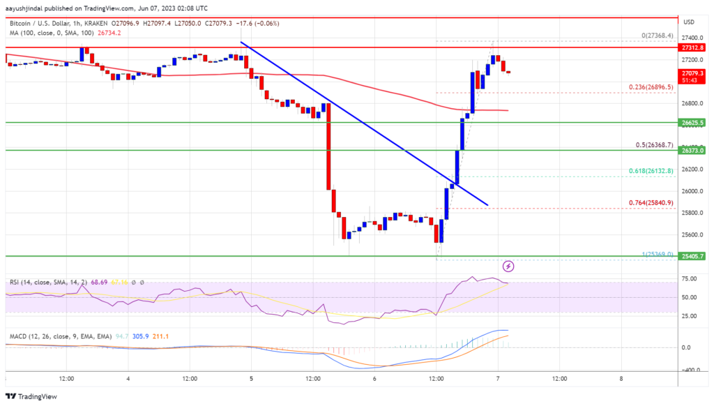 Bitcoin price is trading above $26,500 and the 100 hourly Simple moving average. Immediate resistance is near the $27,400 level. The next major resistance is near the $27,500 level. A close above $27,500 might send the price further higher.