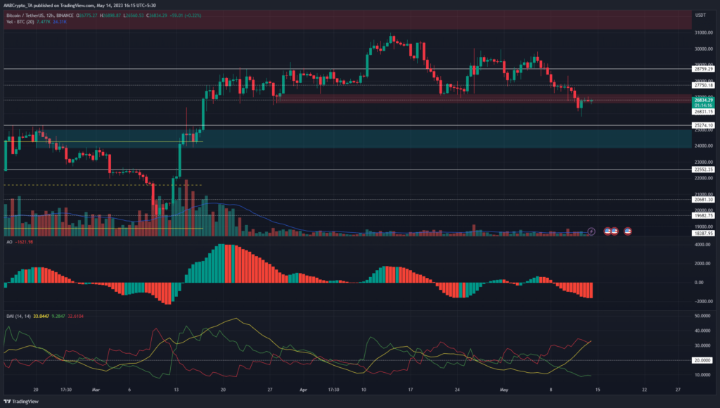 On 8 May, BTC slipped below $27.8k and at the time of writing it hovered around the $26.8k area.