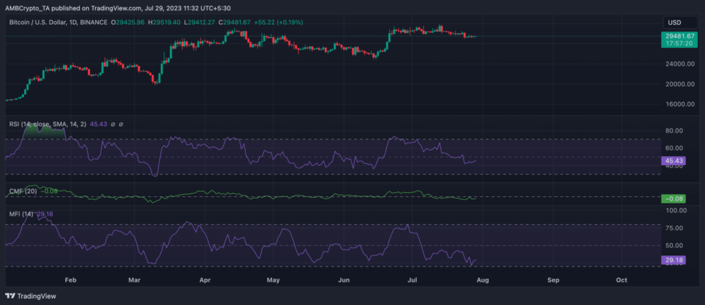 At press time, the leading coin exchanged hands at $29,363.01, per data from CoinMarketCap. At press time, BTC’s weighted sentiment was -0.421. This metric has lingered beneath the zero line since the beginning of June. Poor sentiment has caused the coin’s price to oscillate within the $29,000 and $32,000 tight range since April.