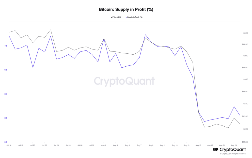 As Bitcoin’s [BTC] price stalled at $26,000 following the recent capital exodus, its price plunged to lows last seen in June. The coin’s supply in profit has declined, while its supply in loss has increased, pseudonymous CryptoQuant analyst Onchained revealed in a new report.