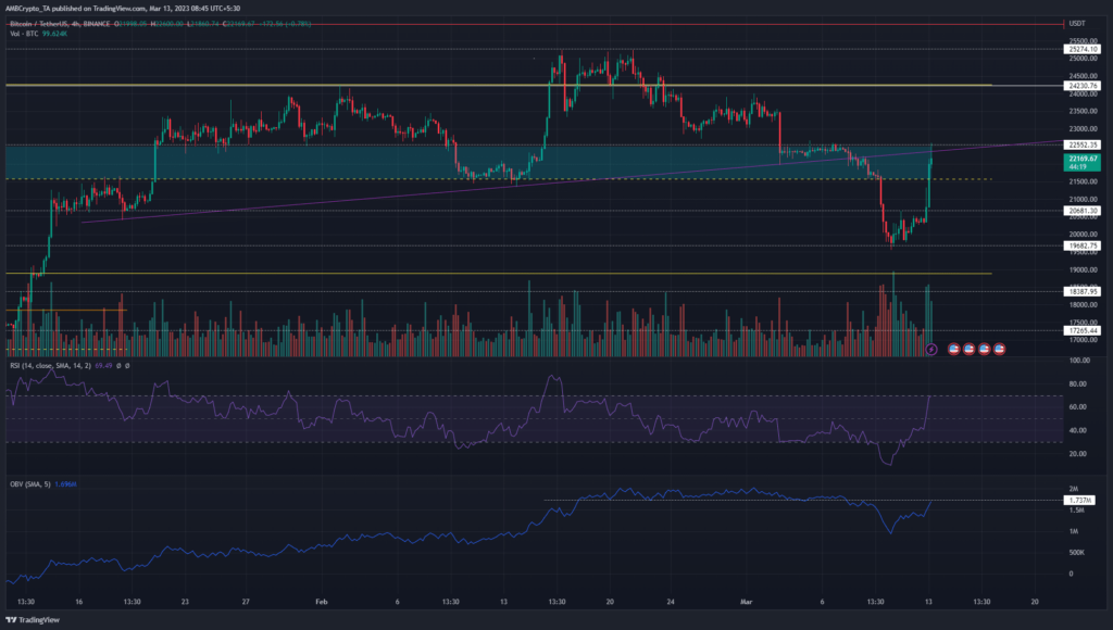 The lower high at $22.6k formed early in March and developed over four days, while the $20.6k one occurred over a weekend. Hence, Bitcoin buyers had grounds to remain cautious despite the swift gains in recent hours.