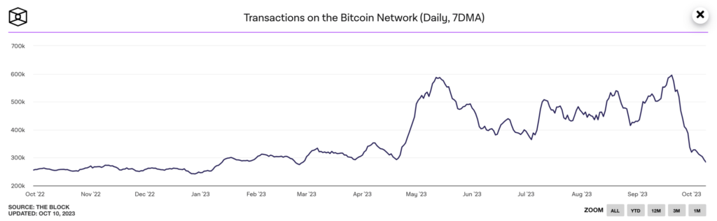 After a surge in September, the number of daily transactions on the Bitcoin [BTC] network has been on a downward trend since the start of October, according to information retrieved from The Block Data.