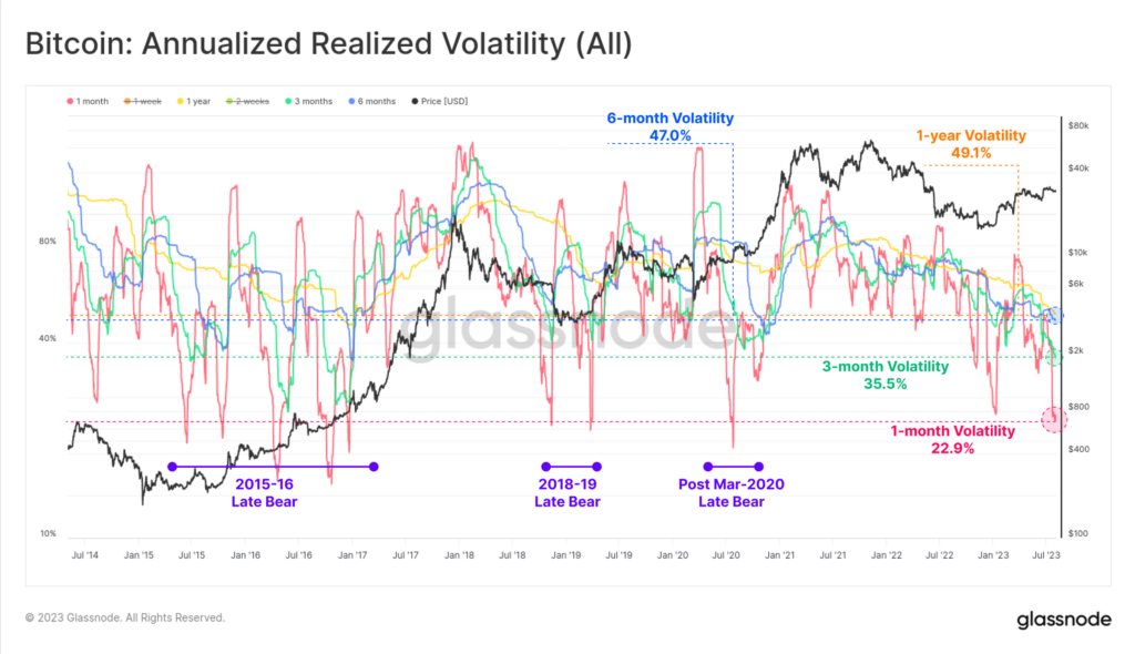 Infamous for the significant volatility in its price, the past few months have been marked by volatility compression for the leading coin Bitcoin [BTC], Glassnode found in a new report. With most BTC trading sessions marked by “quietness,” “fewer than 5% of trading days have a tighter trade range,” the on-chain analytics firm noted.