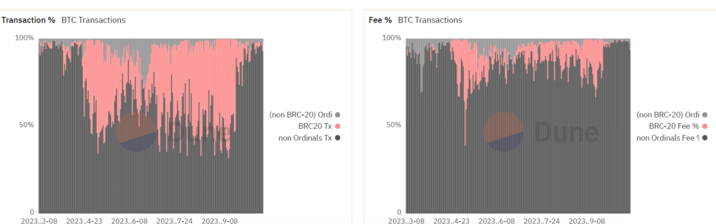 Data from Dune Analytics reveals that in September, BRC-20 experienced an impressive peak of 400,000 transactions. During that same month, BRC-20 transactions accounted for over 60% of the total BTC transactions. Additionally, the volume of these transactions contributed to more than 30% of the fees collected by the Bitcoin network.