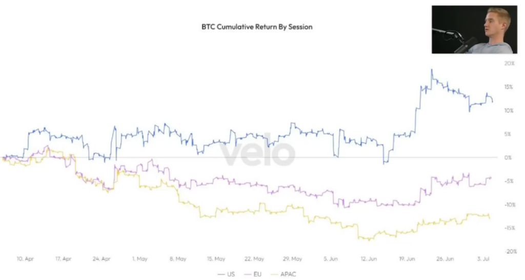 There are two things that I look at as evidence of that. The first is what’s called cumulative return by session that we can look at from Velo data… We have it broken down into the EU, APAC and then US trading sessions. What we can see is that, especially since the BlackRock filing but even slightly beforehand, we can see that the US has been more actively bidding BTC relative to those other trading sessions.“