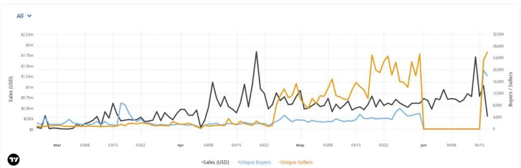 However, activity increased in June, with the daily sales volume breaking the $1 million mark for the first time in nearly two months on 14 June. This also marked a 26% increase in weekly sales volume.