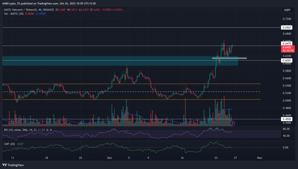 The RSI had a sideways movement just below the overbought zone. It meant that buying pressure fluctuated, and MATIC could extend the range into the weekend. If so, traders can exploit the range-high ($0.64) and range-low ($0.60) for gains.