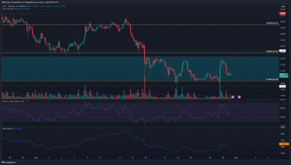 The lowered volatility after the sharp drop in mid-August saw Solana developing a range. It extended from $20 to $22.18, with the mid-range mark at $21.09. At press time, SOL was trading at $20.7, which had been resistance a few days ago but was flipped to support during the recent bounce.