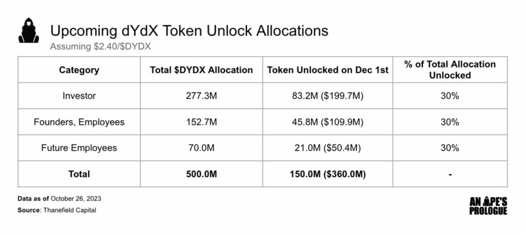 Over 45% of the circulating DYDX supply, valued at $360.0 million, is set to become accessible, with investors receiving the largest allocation, accounting for 25% of the circulating supply, worth $199.7 million.