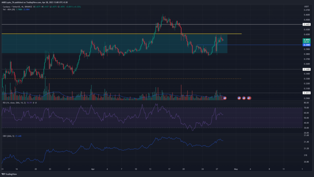 Therefore, the lower timeframe retracement to $0.4 was likely to be followed by an ADA surge. To the north, notable resistance levels lie at $0.44 and $0.485.