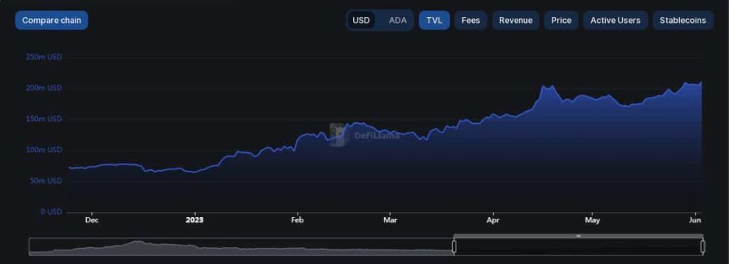 Since the start of the year, Cardano’s total value locked (TVL) tripled in value to $210 million at press time. As per DeFiLlama, Cardano was one of the best performing chains in the last 30 days, logging a growth rate of 12.55%.