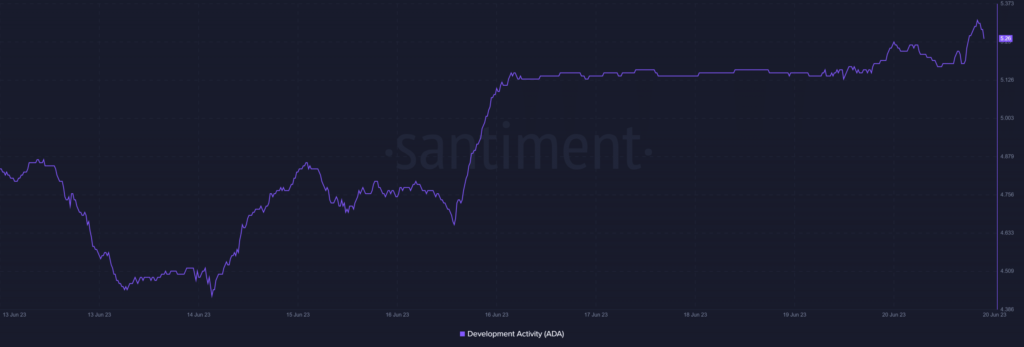 This new update was reflected on Cardano’s on-chain metrics. As per Santiment’s data, ADA’s development activity surged substantially last week, displaying the efforts made by developers to improve the network.