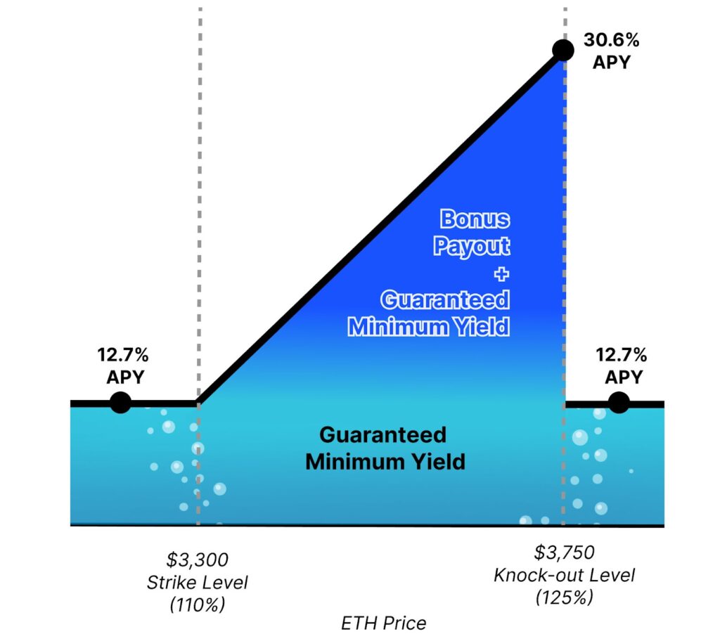 Stablecoins’ lending yield forms the baseline return, while a portion of the yield is used to purchase out-of-the-money (OTM) call options on crypto assets — the “bull” component, driving the high bonus payouts if prices rise.