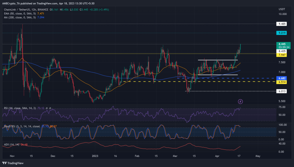 It rose from $6, consolidated, then surged to $8.5 at the time of writing. Overall, LINK rallied over 40% since mid-March but had hit a key Q1 2023 price ceiling that could invite sellers unless Bitcoin [BTC] remains bullish.