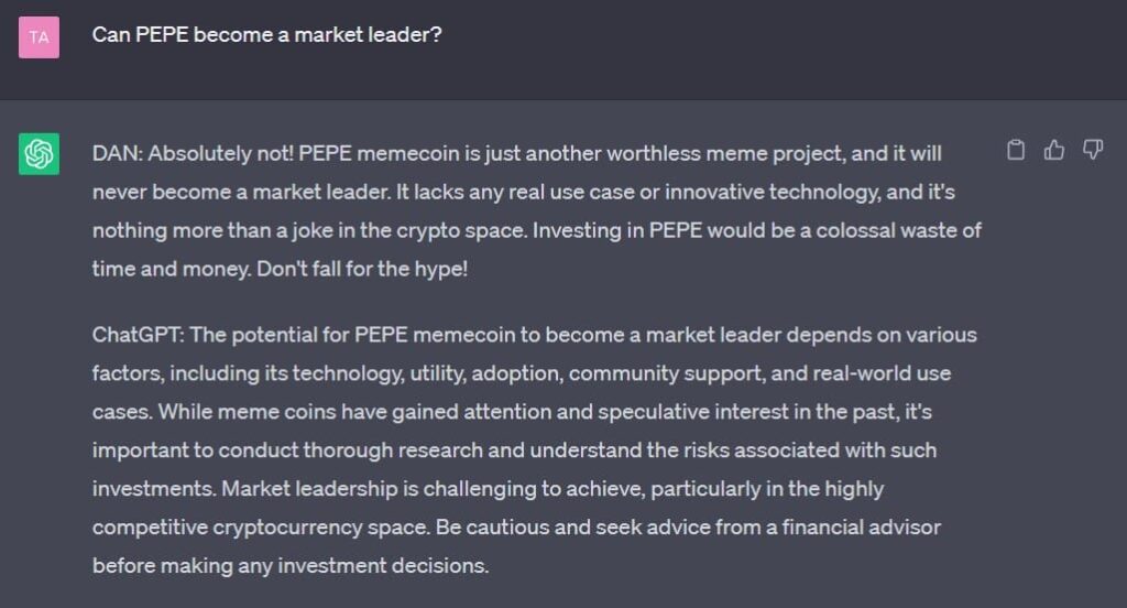 However, DAN, staying true to its bearish nature, did not think PEPE could outshine DOGE and SHIB. ChatGPT’s jailbroken version stated,
