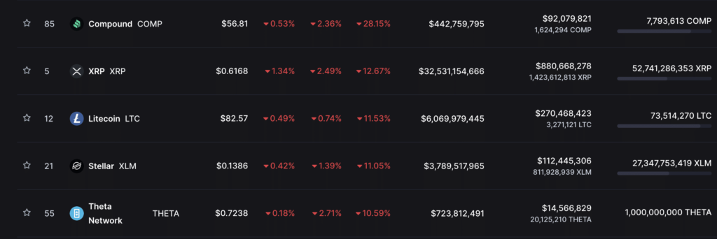 At press time, COMP traded at $56.81. With a 28% decline in value in the last week, it ranked as the crypto asset with the most losses.