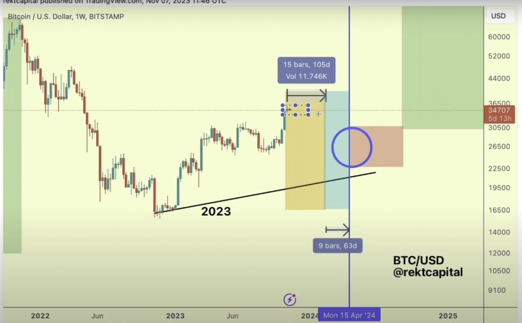 Crypto analyst Rekt Capital tells his 370,300 followers on the social media platform X that Bitcoin could repeat a 2016 price pattern and decline by 40% after a pre-halving rally.