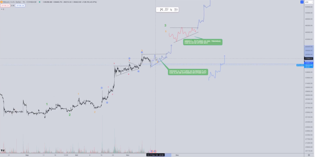 Looking at the trader’s chart, a break of the $38,000 level would mark the end of wave four and push BTC toward his target at around $44,000.