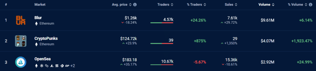 Further data from DappRadar suggests that the CryptoPunks market commands a larger sales volume than NFT marketplace OpenSea, which has recorded a volume of $2.92 million over the last 24 hours. The CryptoPunks collection only sits below Blur, with a massive $9.61 million sales volume.