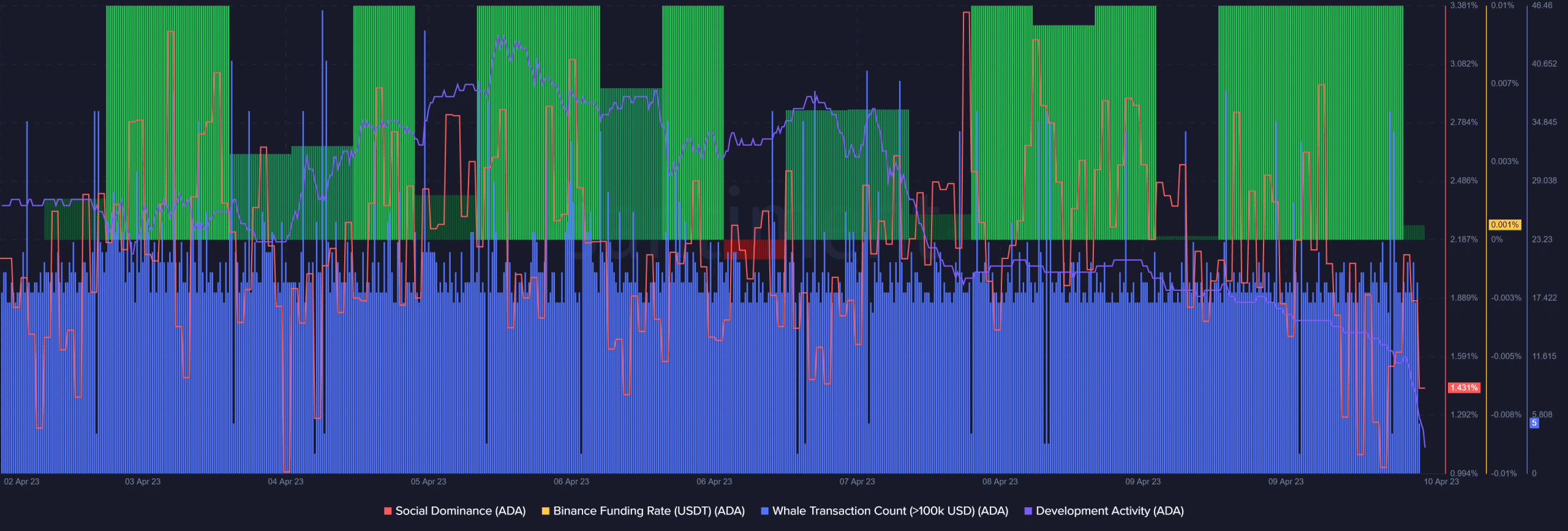 It was surprising that despite the aforementioned updates, ADA’s development activity declined over the last week, which in general is a negative signal. However, apart from that, the rest of the metrics were in decent states.