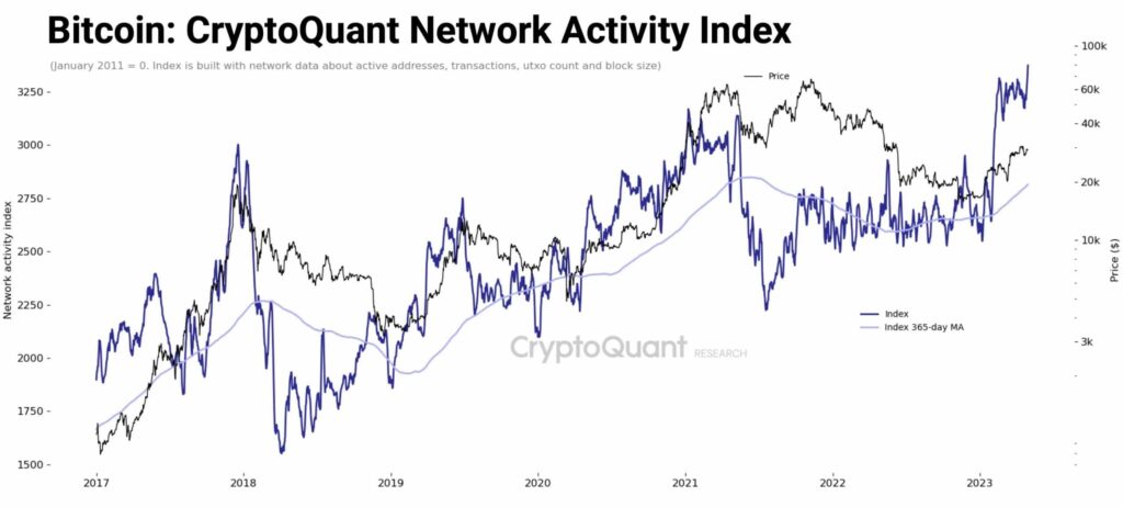 Blockchain analytics firm CryptoQuant devised a Bitcoin Network Activity Index to capture the burgeoning activity on the chain. The index takes into consideration key indicators like transactions, addresses and demand for block space.